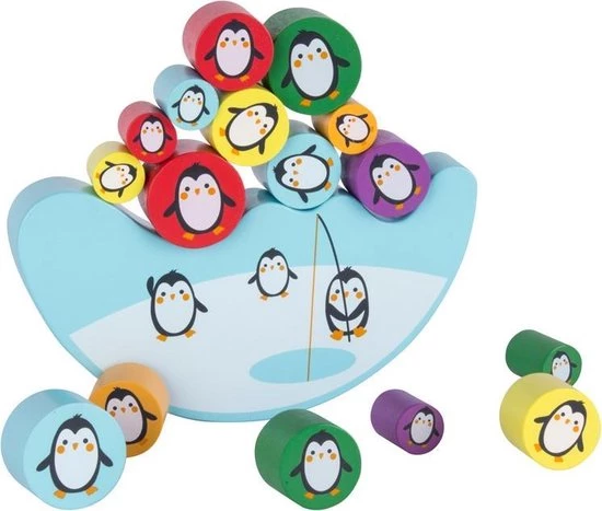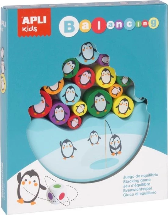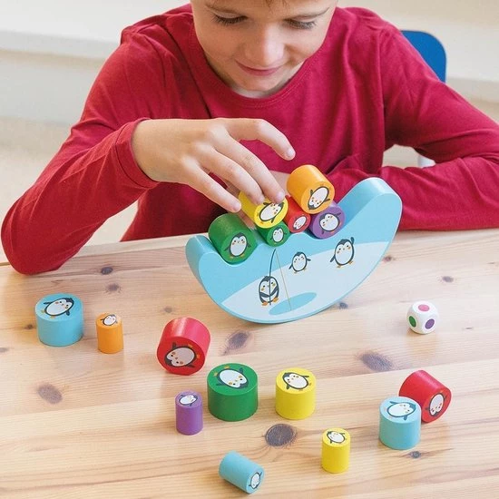 Evenwichtsspel met 16 houten stukken met pinguïns, een houten basis en een dobbelsteen met de kleuren van de stukken. Het spel bestaat uit het werpen van de dobbelstenen en het plaatsen van de pinguïns, van de kleur die door de dobbelstenen wordt aangegeven, de ene gebalanceerd op de andere zonder te vallen. Er zijn drie verschillende maten pinguïns om het spel leuker te maken.