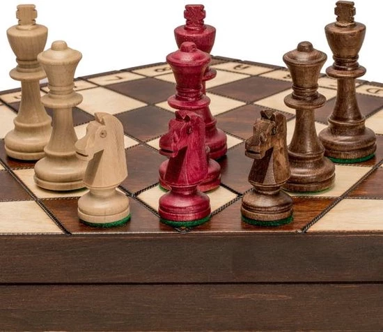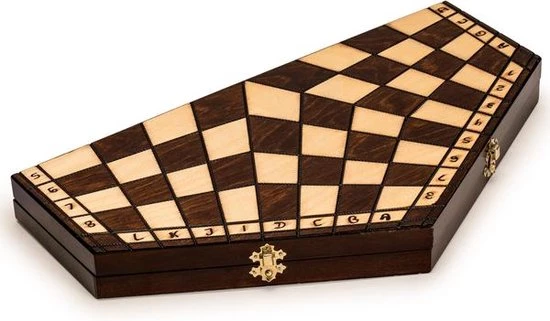 Dit schaakset voor 3 spelers is erg handig door het grote formaat van deze set. Het inklapbare schaakset is verkrijgbaar in standaard (bruine) kleur. De schaakstukken zijn gemaakt van haagbeuk en beukenhout en hebben een zwarte vilten aan de onderkant om beschadigen van het schaakbord te verkomen. Aan elke set is een folder met de regels van het spel toegevoegd. Het schaakbord heeft drie compartimenten afgewerkt met viltvoering voor de opslag van schaakstukken binnenin. Het schaakset is voorzien van een mooi afgewerkte zeshoekige schaakbord dat is voorzien van met vilt beklede vakken voor het opbergen van de schaakstukken.