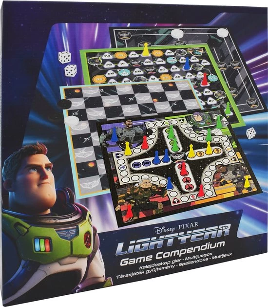Zin een bordspel maar je kan niet goed kiezen? Geen probleem in deze doos zitten 4 verschillende spelborden en verschillende dobbelstenen zodat je elke dag een ander spel kan spelen. De vier spelborden bestaan uit Slangen en Ladders, molenspel, dammen en een ludo (mens-erger-je-niet). Lightyear en zijn vrienden maken het spelplezier alleen maar groter.