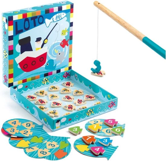 Educatief lotto spel van Djeco waarbij de spelers hengelen naar de genummerde vissen met een magnetische hengel. De eerst die zijn bord vol heeft, heeft gewonnen!