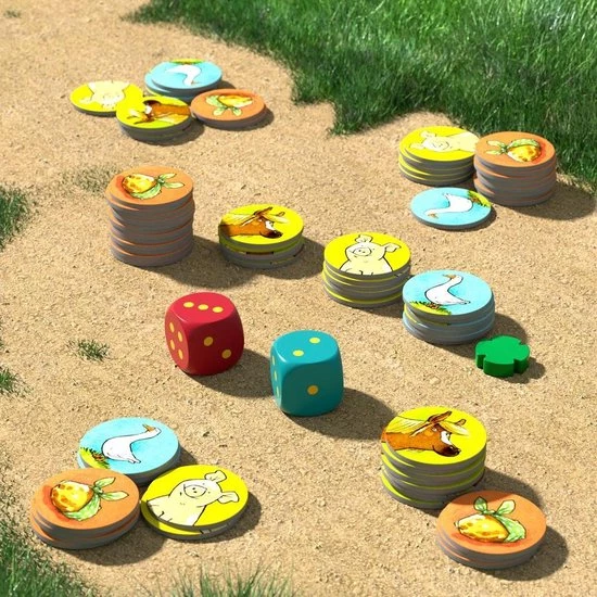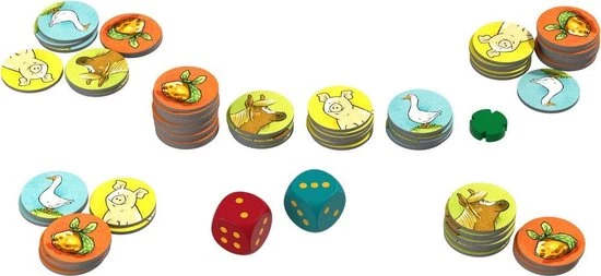 - Inhoud: 72 plaatjes (29 x goudklomp, 16 x paard, 14 x varken, 13 x gans), 1 klavertjevier, 2 dobbelstenen, 1 spelhandleiding.