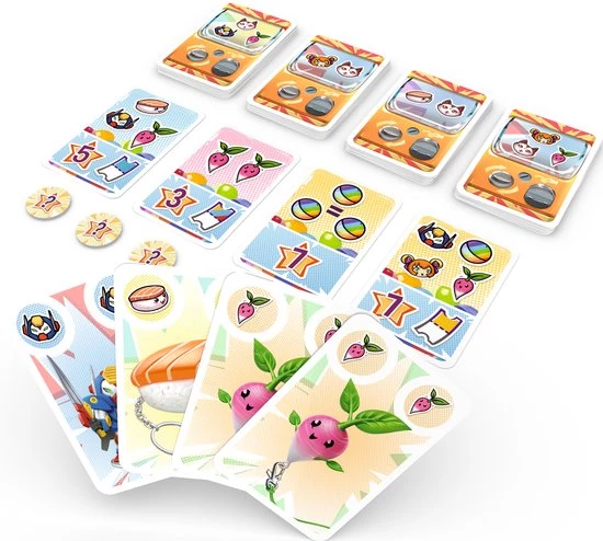 Wie kent die automaten met speeltjes in plastic ballen nou niet? Het is altijd spannend wat je zal krijgen. In Gasha beleef je die spanning in een gestroomlijnd verzamelspel dat leuk is voor jong en oud. Elke beurt trek je 2 kaarten. Op de achterkant van elke kaart zie je welke speeltjes je kunt krijgen. Kies de goede automaten en vorm van de speeltjes die je krijgt setjes die je kunt inwisselen voor punten en bonussen.