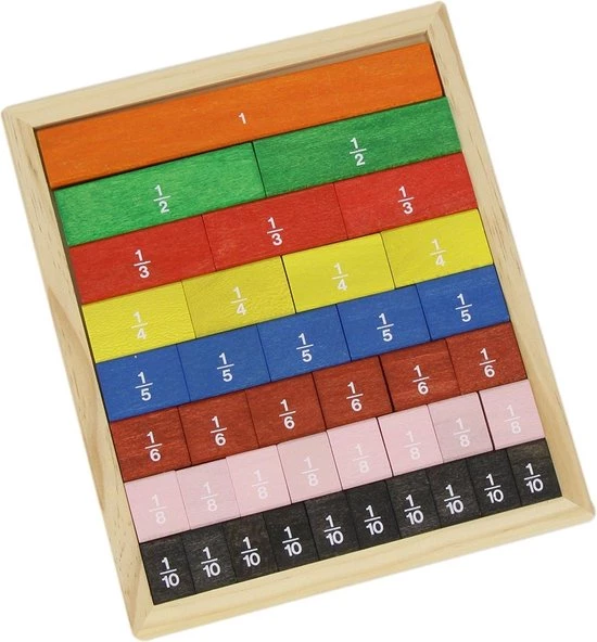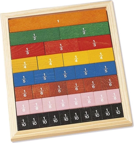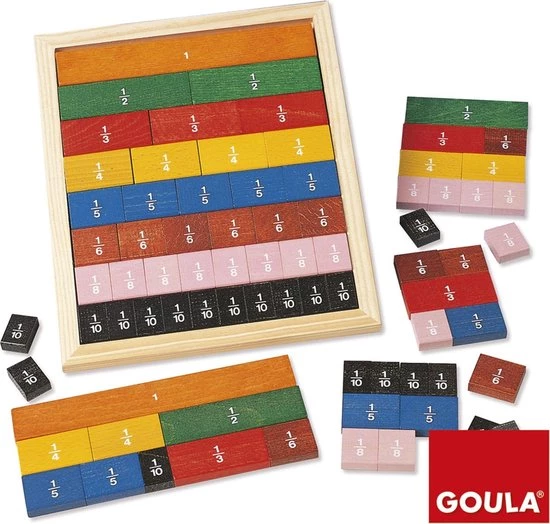 Mooie houten plaat met losse stukjes ‘breuken’ in 8 verschillende kleuren. Spelenderwijs krijgen kinderen meer begrip van de verhoudingen tussen verschillende breuken. Zowel visueel als fysiek. Algemene informatie over Goula: Dit van oorsprong familie-bedrijf maakt al sinds 1942 houten speelgoed. De artikelen staan bekend om hun eenvoud en veelzijdigheid tegelijk. Uw kind leert spelenderwijs, waarbij eigen denkvermogen, co?rdinatie en creativiteit worden gestimuleerd. Alle Goula-producten zijn ontworpen en geproduceerd volgens de strenge EC-standaard. Daarbij wordt gebruik gemaakt van topkwaliteit, duurzaam hout en niet-giftige verf en lak-soorten. Hout is een biologisch afbreekbaar materiaal, in harmonie met de natuur. Dit maakt het bij uitstek een zeer geschikt materiaal voor kinderen van alle leeftijden.