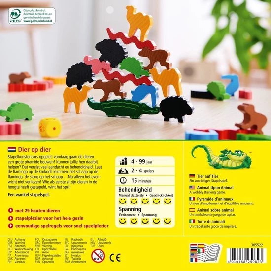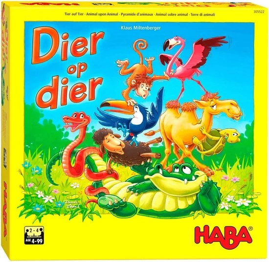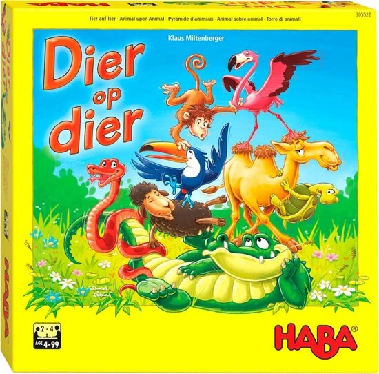 Dier op dier – Het wankele stapelspel geeft stapelplezier voor het hele gezin. De 29 houten dieren vormen een grote piramide. Nu wordt van de spelers veel aandacht en behendigheid gevraagd. De flamingo moet op de krokodil klimmen, het schaap op de flamingo, de slang op het schaap … Nu alleen het evenwicht niet verliezen! De speler die als eerste al zijn dieren veilig in de hoogte heeft gestapeld, is de winnaar.