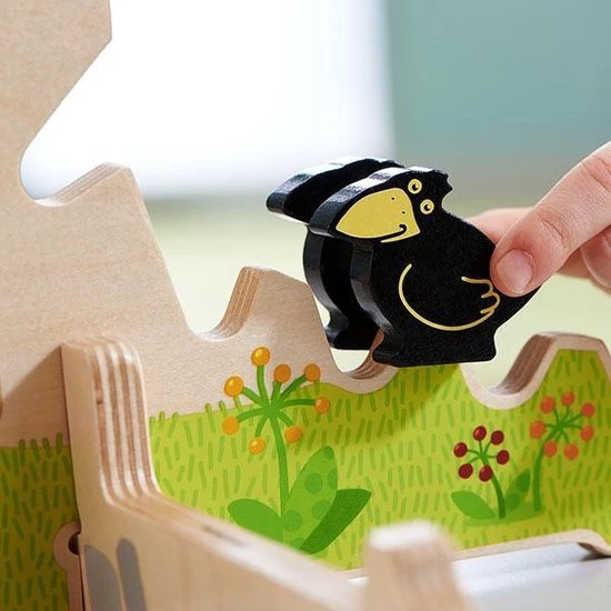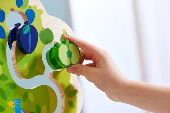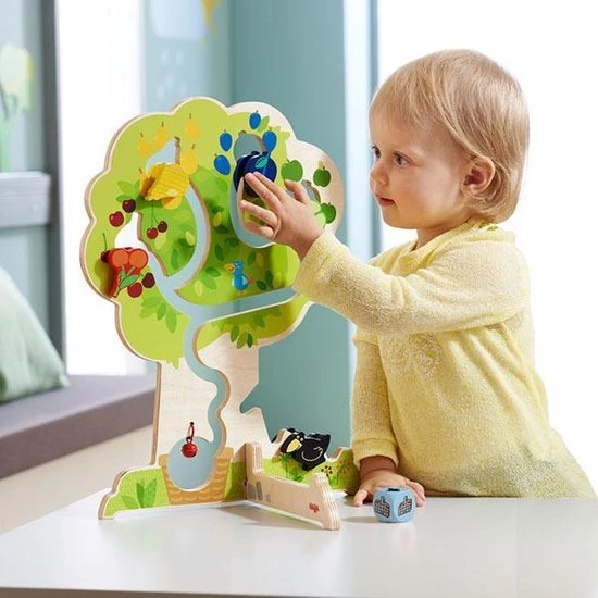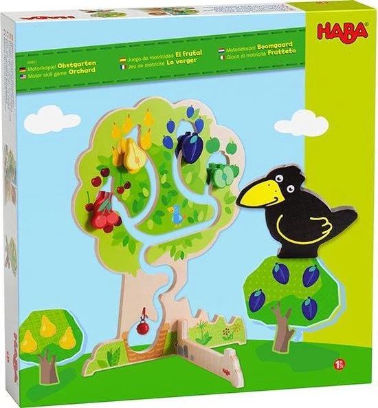 Met dit leuke motoriekspel Boomgaard leren kinderen kleuren en vormen kennen en ordenen. Het spel bevordert de fijne motoriek en is langs beide zijden bespeelbaar. De kleurrijke rollen brengen kleine kinderhanden in beweging. Er wordt gespeeld volgens de eenvoudige regels van het klassieke HABA-spel Boomgaard: de kinderen proberen bij het oogsten alleen of samen sneller te zijn dan de brutale raaf. Natuurlijk is het ook leuk om de rollen op kleur te sorteren of om ze naar believen door de kruin van de boom te schuiven.
