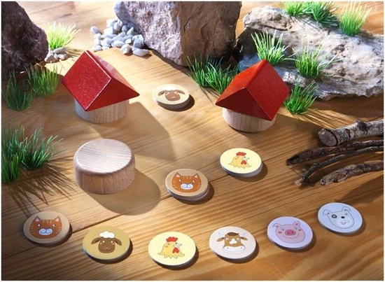 Inhoud: 18 dierplaatjes (3 x haan, hond, kat, koe, schaap, varken), 3 huizen, 2 daken, spelregels