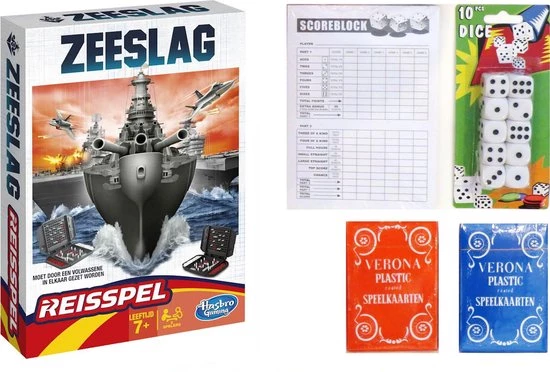 | Verpakkingsinhoud | 1, x, reiseditie, Zeeslag<br, />2, keer, pak, speelkaarten<br, />1, x, scoreblok, yatzee<br, />10, x, dobbelstenen |