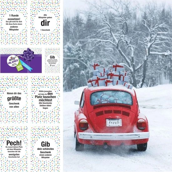 Durch W?rfeln und Ziehen von 107 jederzeit passenden Auftragskarten sowie zahlreiche Variationsm?glichkeiten wird ein Spiel rund um Geschenke gespielt. Die Geschenke wechseln aufgrund der spannenden Auftragen immer wieder den Besitzer oder die Besitzer den Ort. Daraus erwachsen enorm viel Geselligkeit und Spa?!