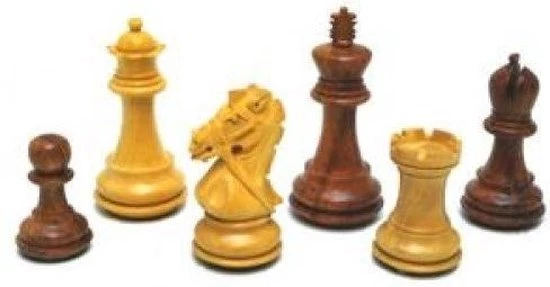 Schaakstukken Rein Knight. Blank / bruin Palisander/palmhout Maat 6 Triple Verzwaard met Vilt. Koningshoogte 96 mm.handgesneden paarden.