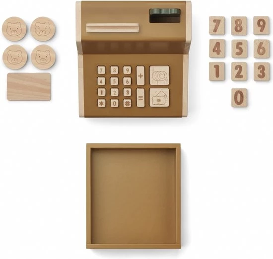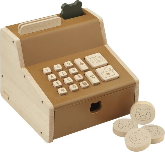 Houdt je kindje ook zo van winkeltje spelen? Met deze houten kassa van LIEWOOD is je winkeltje helemaal af! Inclusief een creditcard, set houten cijfers en houten geld. De kassa heeft drukbare knoppen en een verwijderbare lade met slot. Deze kassa staat garant voor urenlang speelplezier!