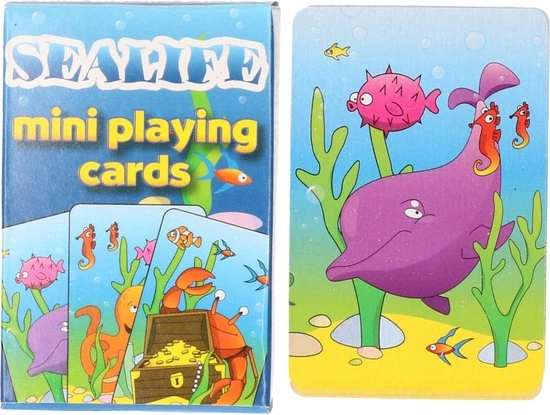 Mini zeedieren thema speelkaarten 6 x 4 cm in doosje. Materiaal: karton. 48 kaarten per spel. Leuke kleine kaartspelletjes voor kinderen en/of volwassenen. Handig formaatje.