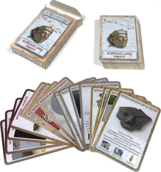 De Noordelijke grens van het Romeinse rijk liep zo’n 2000 jaar geleden dwars door Nederland, langs de toenmalige rivier de Rijn. Er worden daar nogsteeds gebruiksvoorwerpen, schepen en resten van Romeinse leger- en woonplaatsen gevonden. Dit kwartetspel bevat 52 kaarten met foto’s en weetjes over de Romeinen in Nederland.