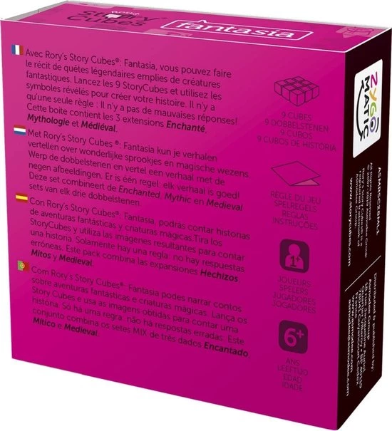 Met deze Rory?s Story Cubes Fantasia vertel je verhalen over wonderlijke sprookjes en magische wezens. Rol de dobbelstenen en verzin een verhaal met de negen zichtbare afbeeldingen. Kun jij met alle 9 afbeeldingen een verhaal bedenken? Er is ??n regel: elk antwoord is goed!