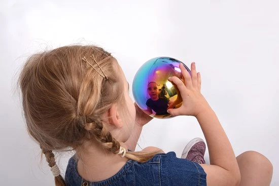 Het color burst-effect zorgt voor een spectrum van heldere metallic tinten op elke bal, met een fascinerende reflectie die vervormt als een fish-eye-lens om kinderen een intrigerend beeld van zichzelf en hun omgeving te geven.