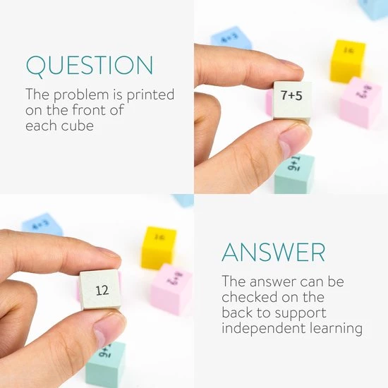 - VOOR- EN ACHTERKANT: De rekensommen staan op de voorkant van de blokjes. Draai ze simpelweg om, om de antwoorden te bekijken.