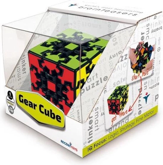Gearcube – Brainpuzzle. The Gear Cube is een tegek nieuw concept in Cube Design en heeft de volgende inventieve stappen.Het maakt gebruik van een Full gear mechanisme dat 12 keer om 90 graden draait voor een complete rotatie. Een fantastich ontwerp. Moeilijkheidsgraad: 4,5 van de 5 sterren. Recent Toys