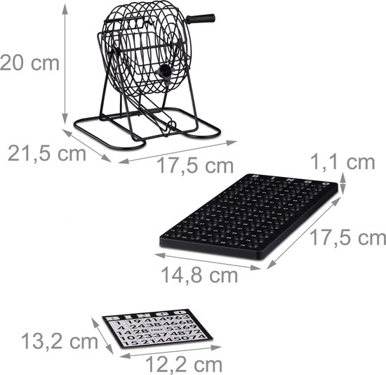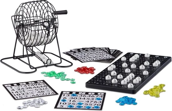 De zwartgelakte bingomolen is uiterst stabiel en door zijn design er net uitziet als de echte bingomolens. 75 ballen, 150 bingo chips, 2 spelborden en 18 bingokaarten maken de set volledig.