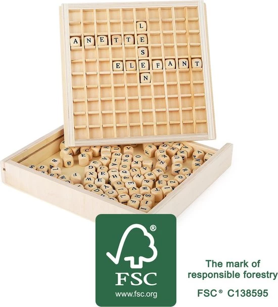 Met deze letterdobbelstenen van FSC? 100% gecertificeerd hout kunnen kinderen hun eerste woordjes maken. Met het inlegbord blijven ze waar ze horen en raken ze niet kwijt. Alles kan worden opgeborgen in een houten kist en kan gemakkelijk worden vervoerd.