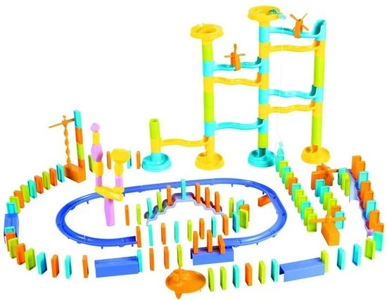 Dit domino spel van Square bestaat uit maar liefst 188 dominosteentjes en een heleboel aparte elementen waarmee je de kettingreactie nog spannender kunt maken. Door alle steentjes rechtop en dicht achter elkaar neer te zetten in een door jou gewenst patroon, cre?er je een spannende route. Tussendoor kun je de verschillende elementen opbouwen, welke onder andere bestaan uit een knikkerbaan en een draaimechanisme. Heb jij stalen zenuwen en zijn jouw handen vast genoeg om alle 188 dominosteentjes op te bouwen zonder ze tussentijds om te laten vallen?