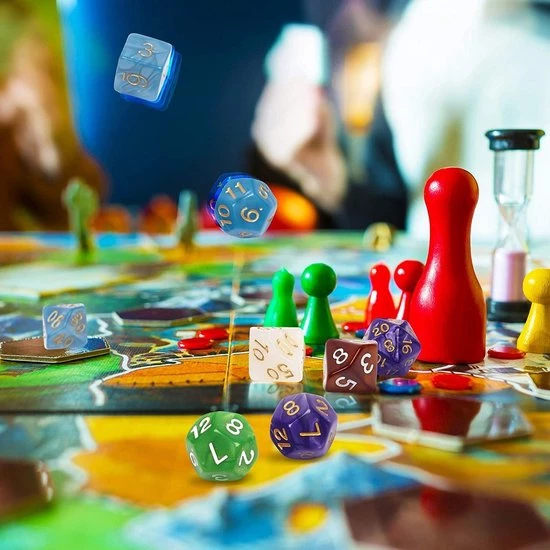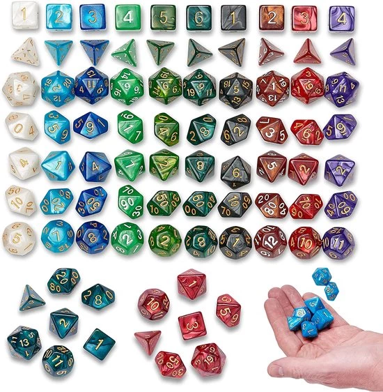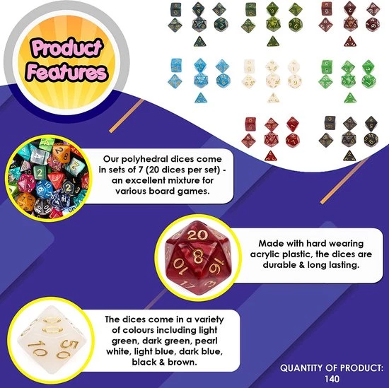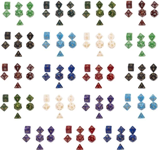 Deze mooie Dungeons & Dragons dobbelstenen van The Twiddlers zijn perfect om veel verschillende spellen mee te kunnen spelen! De dobbelstenen zijn onder andere geschikt voor het spelen van bordspellen, Yahtzee en Dungeons & Dragons en worden geleverd in sets van zeven stuks. In één setje zitten zeven dubbelstenen: D4, D6, D8, D10 (00-90), D10 (0-9), D12 en D20. De dobbelstenen zijn gemaakt van stevig en kleurvast acryl, waardoor ze duurzaam zijn en lang meekunnen. Deze set bestaat uit 140 stuks met allerlei verschillende prachtig gekleurde varianten.