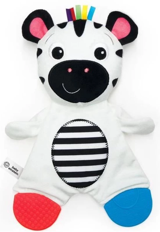 Prikkel de zintuigen met deze Zen the Zebra (TM) pluche zebra-bijtring. Met Zen de Zebra, dit schattige en rustige personage uit de Baby Einstein (TM)-films, leert je nieuwsgierige kleintje snel. 2-in-1 speelgoed voor pasgeborenen en ouder. Tactiele en visuele ontdekking van getextureerde materialen in wit en zwart