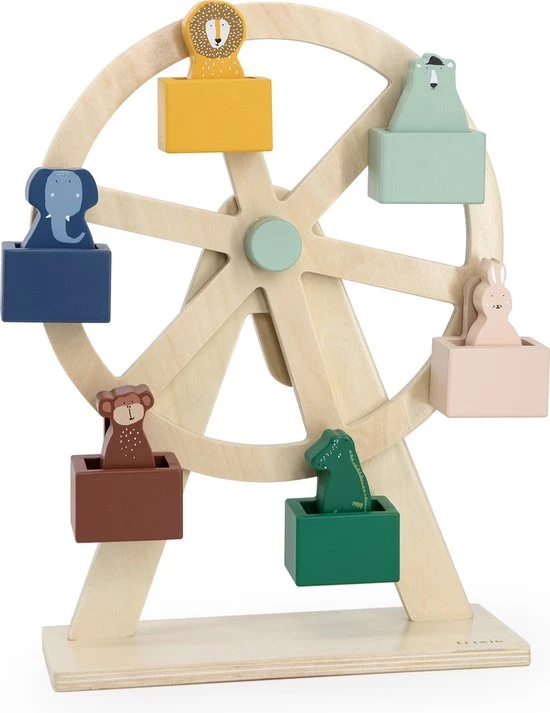 Draaien maar! Al onze dierenvrienden genieten van een ritje in het reuzenrad. Kinderen kunnen het wiel doen draaien door middel van de hendel aan de achterkant. Geef elk dier een plaatsje in het rad en laat de pret beginnen! Het reuzenrad en de dieren zijn gemaakt van 100% FSC ? gecertificeerd hout. Alle verven zijn op waterbasis en veilig voor baby’s. 26 x 10 x 31 FSC? MDF – FSC? beukenhout – FSC? multiplex