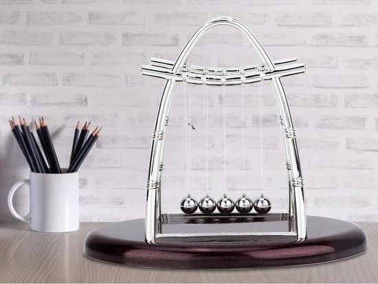 Newton pendel cradle met 5 ballen. De bekende Newtonpendel voorzien van 5 metalen en identieke ballen welke met draad aan het frame hangen. Materiaal: metaal/nylon. Afmetingen: Hoogte: 18 cm Lengte voet: 23 cm Breedte voet: 14 cm Diameter bal: 1,5 cm